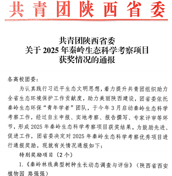 陕西省西安植物园路强强获共青团陕西省委2025年秦岭生态科学...