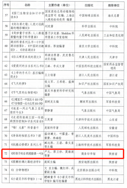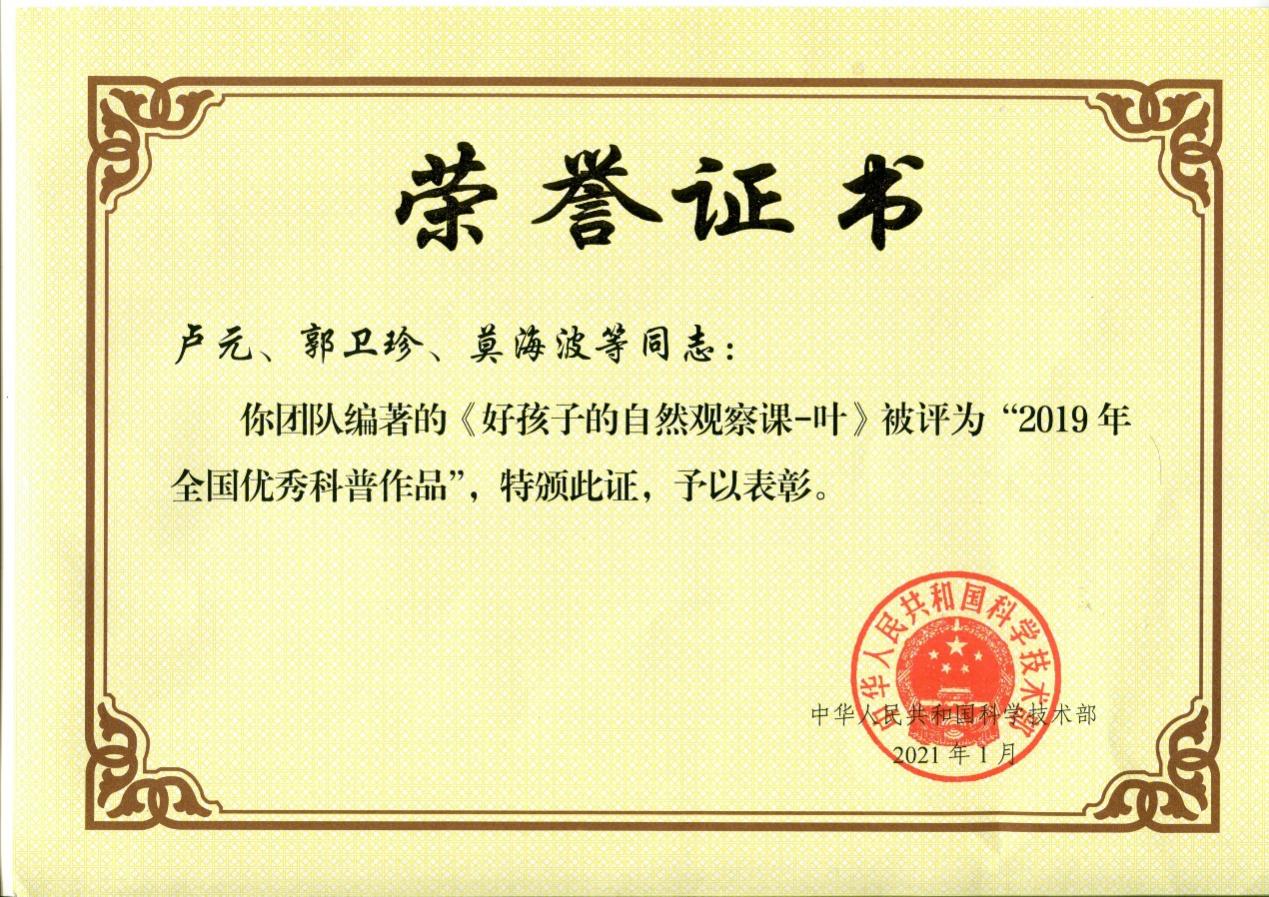 近日,陕西省西安植物园卢元老师的《好孩子的自然观察课-叶》一书获得科技部颁发的“2019年全国优秀科普作品”证书。