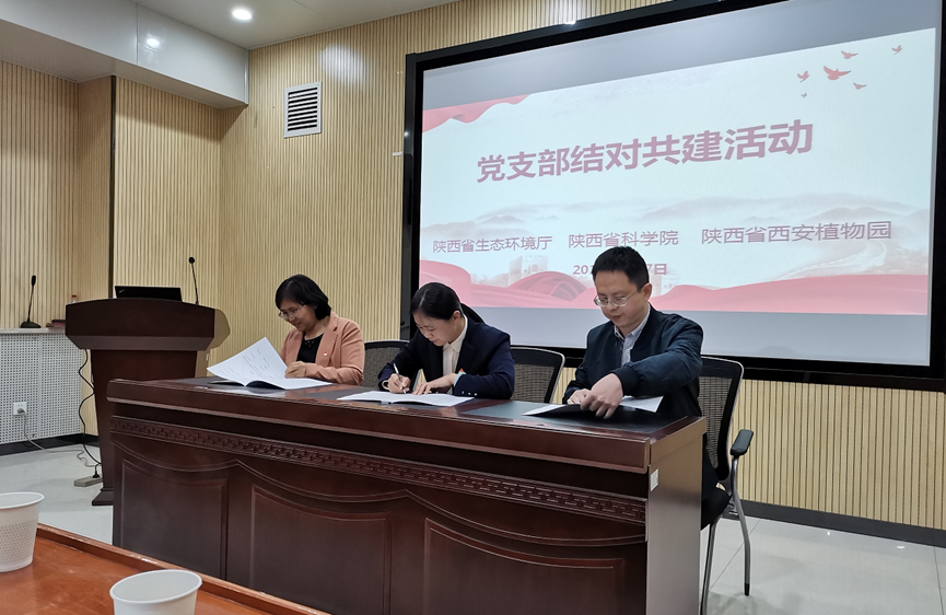 会议首先由杨文正介绍党支部结对共建活动背景,并介绍分省院基本情况及党建工作概况,陕西省生态环境厅自然生态保护处党支部书记、处长孟卫萍,陕西省西安植物园党委书记、副主任陈立也分别对本单位基本情况、业务领域与党建工作等进行简介。随后,三位同志代表各自所在党支部签署了 “1+1+1” 党支部结对共建协议。