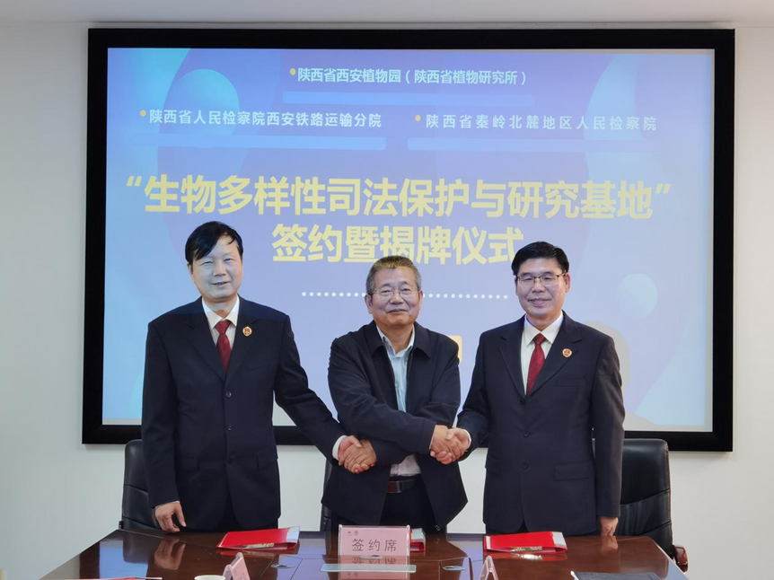 日前,陕西省西安植物园(陕西省植物研究所)、陕西省人民检察院西安铁路运输分院、陕西省秦岭北麓地区人民检察院三个共建单位共同签署了《生物多样性司法?;び胙芯炕毓步ㄐ槭椤?,旨在促进人与自然和谐共生,加强对生物多样性的司法?;び胙芯?。签约当天,陕西省首个“生物多样性司法?;び胙芯炕亍闭浇遗瞥闪ⅰ?