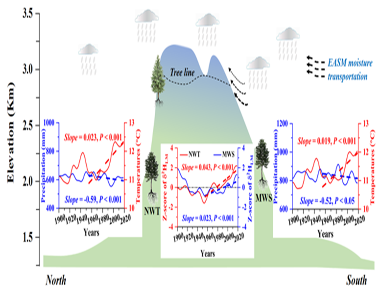 图2 秦岭南北坡及山脊树轮δ2HLM比率的水热指示特征(图片:文章)