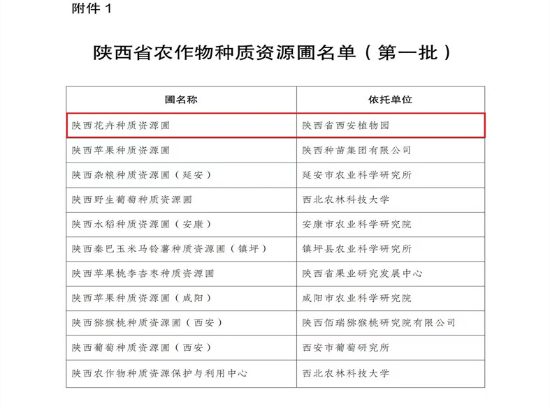 近日,陕西省农业农村厅公布了第一批省级农业种质资源?;さノ幻?,确定了第一批陕西省农作物种质资源圃11个,陕西省西安植物园作为陕西花卉种质资源圃的依托单位位列其中。