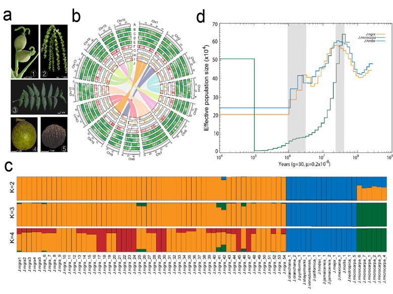 黑胡桃(Juglans nigra,2n=32)隶属于胡桃科胡桃属,为重要的木本经济树种。黑胡桃也称为东部黑胡桃(eastern black walnut, EBW),其木材质量高可作为优质家具等工业材料,果实油脂蛋白含量高且营养丰富,该树种也作为栽培核桃(Juglans regia)砧木的重要资源。该课题组基于前期研究基础,利用二代测序、三代测序、Hi-C测序、不同组织三代全转录组学及二代转录组学测序组装提升并得到了黑胡桃的高质量染色体水平基因组:全基因组大小为540.8 Mb,共注释得到29,506个蛋白质编码基因,scaffold N50值为35.1 Mb,99.0%挂载到了16条染色体上。课题组基于组装注释的高质量染色体水平黑胡桃基因组为参考,通过对黑胡桃组(Section Rhysocaryon)植物74个个体进行重测序,动态历史分析揭示了黑胡桃有效种群大小在气候冰期间迅速减少。比较基因组学发现了黑胡桃、小果胡桃(Juglans microcarpa)和核桃三个染色体水平基因组之间的共线区较高,但三个基因组之间存在600 kb以上的遗传变异倒置区域。与小果胡桃和核桃基因组相比,黑胡桃基因组中插入缺失(InDels)总片段大小分别为18.3 Mb和34.9 Mb。注释结果表明了这些差异基因主要包含五三肽重复序列(PPR)、脂肪酸去饱和酶(FAD)和富含亮氨酸重复序列(LRR)基因家族。