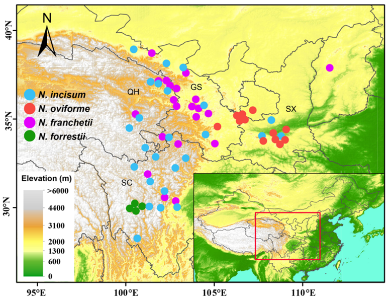 羌活属(Notopterygium)隶属于伞形科(Apiaceae),是我国特有的多年生珍稀濒危草本植物,主要分布于我国陕西、四川、青海、甘肃等省的高寒山区。该论文基于转录组测序(RNA-seq)开发 EST-SSR 分子标记以及简化基因组测序(SLAF-seq)鉴定单核苷酸多态性 SNPs 标记数据,利用系统发育树构建、主成分分析、演化历史模拟以及生态位分化等方法揭示了该属物种杂交起源及其物种形成历史。