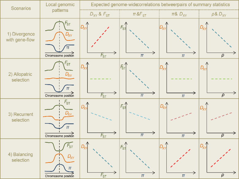 图1 根据基因组遗传多样性和遗传分化方式总结的四个分化模型及参数之间的相关性