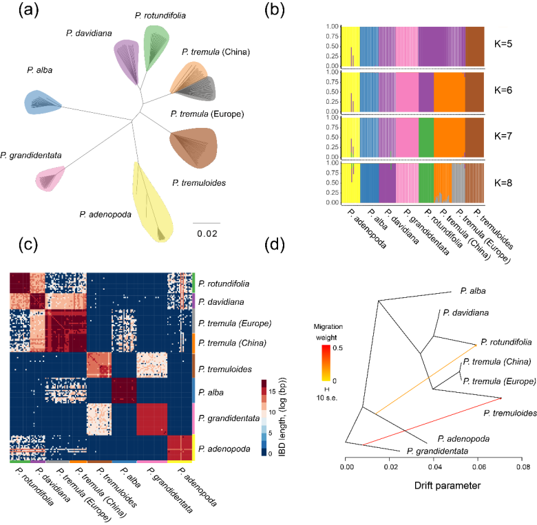 杨属物种广泛分布在欧亚大陆及北美地区,具有重要的经济和生态价值。该属物种是二倍体植物,基因组较小(<500Mb)。由于物种间存在不同程度的基因流和基因渐渗,所以具有重要的研究价值。本论文研究团队利用全基因组重测序技术对杨属 (Populus)白杨组8个近缘物种共201个样品进行了群体遗传学分析,通过使用沿分化梯度的一系列物种对,比较调查了这些物种对间的基因组遗传变异情况。结果显示,不同物种对间的基因组分化模式是比较固定的,连锁不平衡在这种遗传变异的模式中起到重要作用。此外,在物种形成初期,基因流和不完全谱系筛选也在遗传变异过程中扮演了重要的角色。这项研究为更好地理解物种演化的驱动机制提供了重要的参考。
