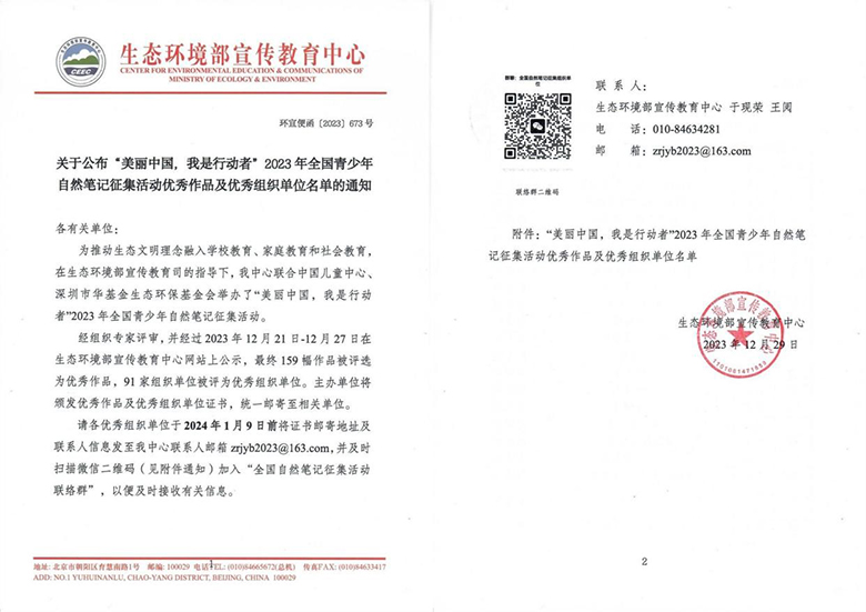 近日,由生态环境部宣传教育中心与中国儿童中心共同举办的“美丽中国,我是行动者——2023年全国青少年自然笔记征集活动”获奖名单公布,全国共评选出优秀组织单位91家,优秀作品159幅。陕西省西安植物园被评选为优秀组织单位,1幅作品获得优秀作品奖。