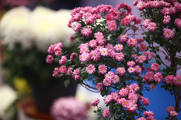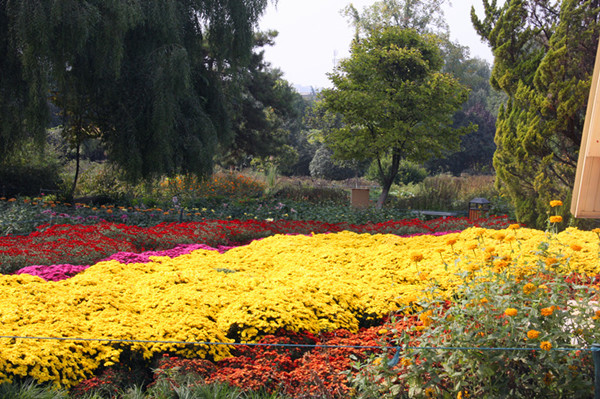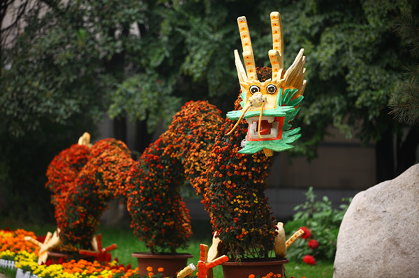 匠心独运、构思巧妙的塔菊、大立菊、造型菊等共有20多种200多盆,一朵朵美丽妖娆、枝条柔软的小菊花被制作成孔雀开屏、盘龙、花篮、花瓶、蘑菇球、花柱、花篱等各种生动精致的造型,栩栩如生,蔚为奇观。微凉的秋风也唤起了地被菊的集体舞蹈,5万余株20余个品种的地被菊成片种植,红如火,黄似星,远观如云如霞,再配以波斯菊、百日草、硫华菊、孔雀草、鸡冠花等花卉,既有山花烂漫的热烈张扬,又有清新怡人的田园风光。