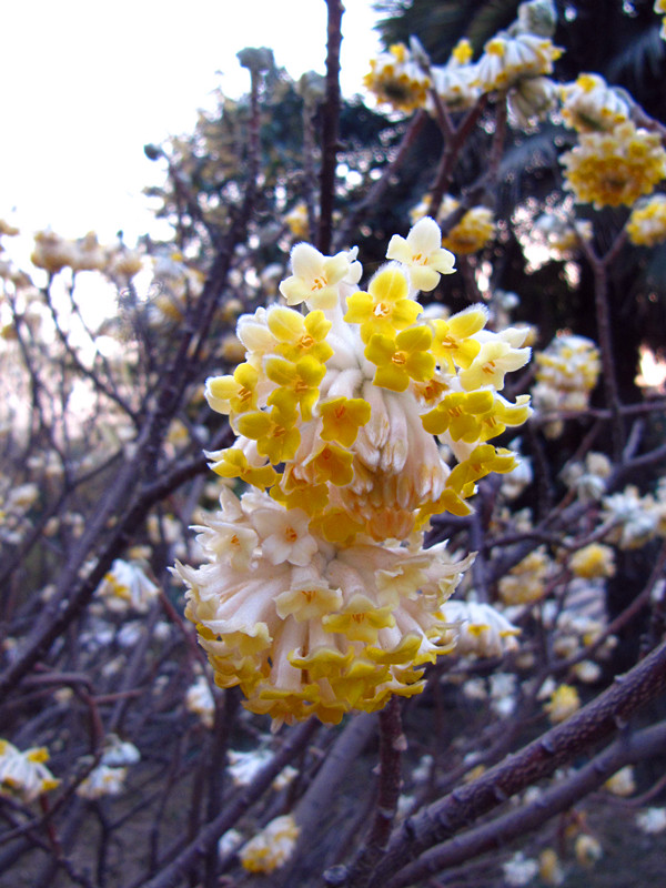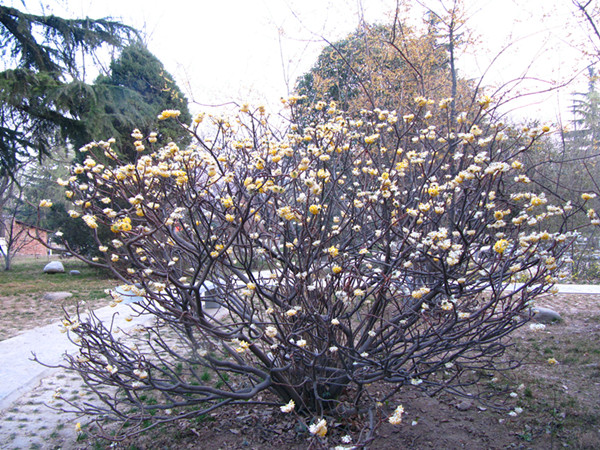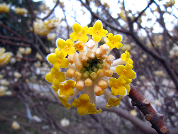 结香(Edgeworthia chrysantha Lindl.)是瑞香科结香属落叶灌木,因其枝条柔软,弯之可打结而不折断,且花多又有香气,故名结香;又因其枝常三叉分枝,故又名“三叉树”;有些地方传说结香可以解梦,晚上做了梦,大清早起来,在没人看见的时候去把它的树枝打个结,如果是好梦就可以实现,是噩梦就可以化解。结香因而也被称作“梦花”。