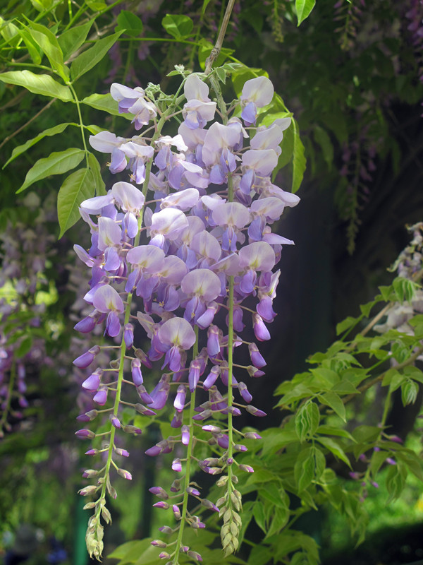相比于其他春花植物,紫藤算是比较“懒”的:当其他春花植物盛开的初春之时,紫藤还光秃秃的,看上去没有一点生气。直到仲春时节,紫藤才从一冬的酣睡中醒来,从枝头上抽出几片羽状的叶片,中间还夹杂着一些青绿色的小穗——这就是紫藤的花序。这些小穗逐渐长大、伸长,颜色也转为青紫,好似一串串深浅不一的紫色水晶珠子。而又仿佛是一夜之间,这些水晶珠子绽放开来,展现出豆科那典型的蝶形花冠,成为了垂挂在枝头的紫色云霞。这些紫色的云霞交织在一起,如梦如幻,散发着清香,令人神迷??吹阶咸倏ǖ娜耍薏换岜荒茄っ赖纳仕鄯?。