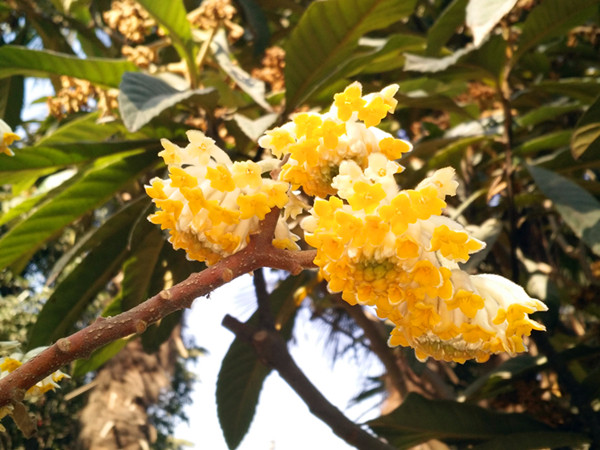 结香开放时,羞涩地低垂着头。远看不起眼,但轻轻托起这毛茸茸的花序,就会惊叹它靓丽的容颜—花序由数十朵筒状四瓣的亮黄色花萼组成,花萼的边缘生有非常漂亮的白色茸毛?;ㄋ块倩粕ǘ溆械能跋?,枝条柔韧性强,就算被弯曲相互缠绕和打结也不会折断。