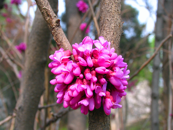 紫荆为丛生或单生灌木,植株不高,2-5米,花朵通常2-10朵在老茎上簇生,没有总花梗,是紫荆属植物在园林上应用最多的一种。同属另一种植物湖北紫荆(C.glabra Pampan),乔木,树体高大,通常6-16米,总状花序,主要分布在湖北的西部至西北部以及陕西的西南部至东南部,这也是陕西太平国家森林公园万亩天然“紫?;ê!钡闹鹘?。其鲜艳绮丽、别具一格的景致堪称“大秦岭天然绝景”。据中国林科院植物专家考证,这儿是我国紫荆最早的发源地,因此有“天下紫荆,源系太平”之说。