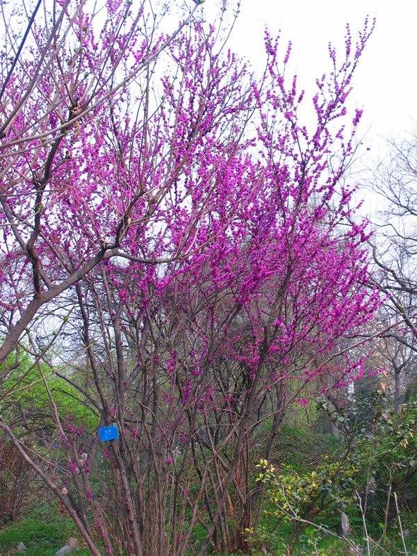 紫荆(Cercis chinensis Bunge),又名苏芳花,暖带落叶灌木。叶片近圆形,全缘,主脉五出。阳春三月,玫瑰色的蝶形花先叶开放,一枝枝,一匝匝,密密层层,如染、如画。满树的嫣红在初春显得极为壮观,所以紫荆又称之为满条红。