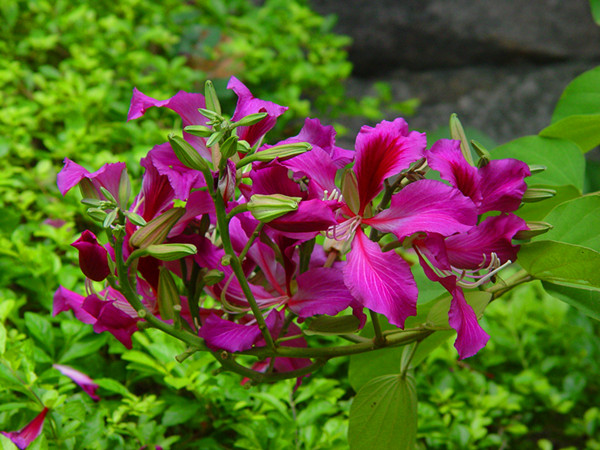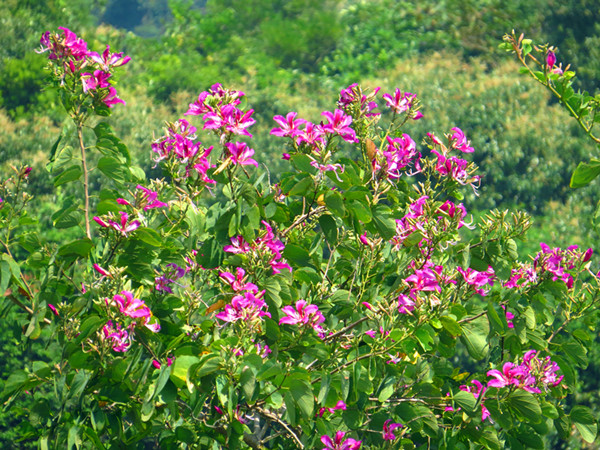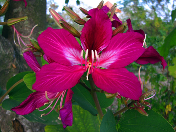 提起香港区花,大家都知道叫洋紫荆。洋紫荆,又名香港?;ǎ缎斡琶浪蒲蛱?,花色娇艳,常绿高大乔木,在华南地区广泛栽培。1997年7月1日香港回归祖国后,其被正式定为香港特别行政区区花。在区徽、区旗上均有其图案,目前是香港行道树的主要树种。其花期多在十月至翌年的4月,花开五瓣,花色紫红,间有白色的脉状彩纹,所以内地又称红花羊蹄甲。十一月,北方已经进入了萧瑟的冬季,而在福建、香港等地,洋紫荆红花烂漫,开满枝头,人们赐之“兰花树”的美称,意有“壮观、繁荣、奋进”的象征。2011年西安世园会香港园留下来的几株洋紫荆目前在西安植物园展览温室中正处于盛花期。