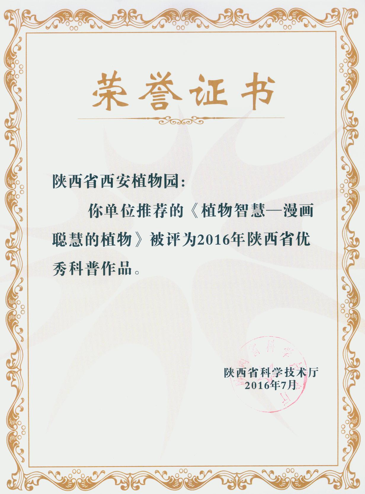 7月13日,在陕西省科技厅举办的2016年陕西省优秀科普作品表彰会上,陕西省西安植物园祁云枝研究员出版的《植物智慧——漫画聪慧的植物》一书,荣获“陕西省优秀科普作品奖”。