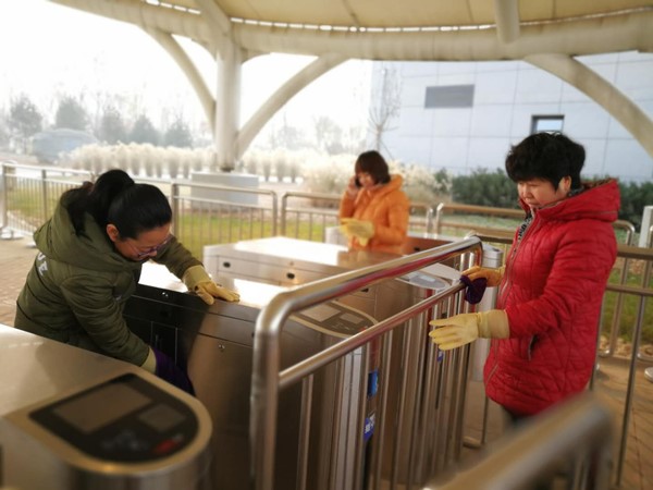 (西安植物园副主任刘立成、韩桂军等一行人检查园区售票处卫生安全情况)