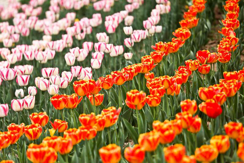 郁金香颜色多样,有深浅不同的红、橙、黄、粉、白、紫、黑和各种复色,以及渐变的色彩和不同的花纹,各种色系的郁金香集中大片栽植,形成色彩斑斓、大气协调的花海效果,远观既像明亮的地毯,又如绚丽的彩虹,美不胜收。