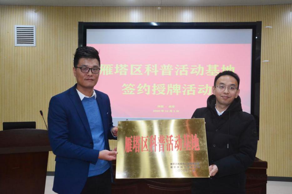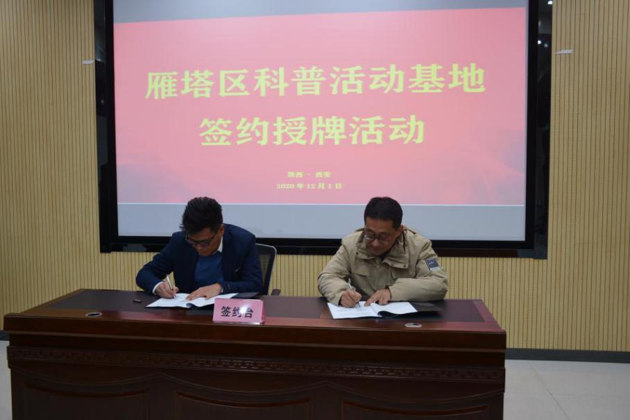 随后,西安市雁塔区科工局调研员谭戈、西安植物园副主任韩桂军共同签署协议,雁塔区科工局副局长刘晓东代表雁塔区科工局向西安植物园授牌。此举标志着西安植物园和西安市雁塔区科工局的合作关系将向更深层次方向推进。