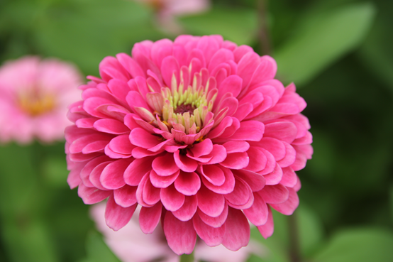 百日菊(Zinnia elegans)又名百日草、节节高、步步登高等。菊科百日菊属,一年生草本植物。原产墨西哥。有单瓣、重瓣、卷叶、皱叶和各种不同颜色的园艺品种。单瓣的百日菊,很容易就可以看到中心的一圈黄色小花(头状花序管状花),与外围的花瓣(舌状花)相映成趣。重瓣的百日菊层层叠叠,内部尚未张开的花瓣(舌状花)卷曲皱缩,隐隐有一种高贵的气息。微风吹过,就像一个个披着美丽衣裳的仙子在舞蹈。百日菊无论是叶子还是茎,都有粗糙的硬毛。叶对生,宽卵圆形或长圆状椭圆形,百日菊的第一朵花开在顶端,然后侧枝顶端开花比第一朵开的更高,因此很多地方又管它叫“步步登高”或“节节高”。