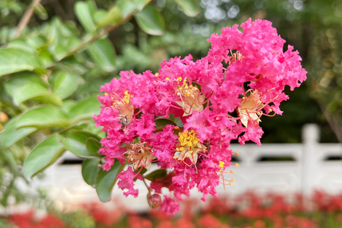 紫薇(Lagerstroemia indica)千屈菜科紫薇属、落叶灌木或小乔木。原产亚洲,现广植于热带地区。紫薇的花非常特别,每朵花有6瓣,整个花型好似一个轮盘,每逢盛开的时候,花朵一般都成串成团地簇拥着,层层叠叠,十分动人。它的花瓣有很多卷曲的皱褶,边缘还有锯齿状,并不刺人,而花朵儿卷曲的皱褶,就像卷笔刀卷出的漂亮铅笔花一样。紫薇花色艳丽,开花时正当夏秋少花季节,花期极长,由6月可开至9 月,故有“百日红”之称,又有"盛夏绿遮眼,此花红满堂"的赞语。就连宋代杨万里也曾在诗中写道:“谁道花无红十日,紫薇长放半年花?!?观赏地点:锦葵园)