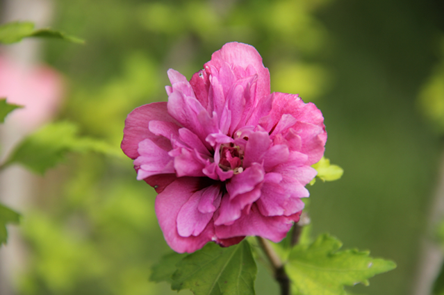 木槿(Hibiscus syriacus)锦葵科木槿属,落叶灌木。叶菱形至三角状卵形,边缘具不整齐齿缺;花单生于枝端叶腋间,花形呈钟状,有单瓣、复瓣、重瓣几种。花朵颜色有纯白、淡粉红、淡紫、紫红等。木槿单朵花花期很短,一朵花只能开放一天,花期结束后它的花朵不是枯萎,而是像茶花一样整朵掉落,因此也称它为“朝开暮落花”。