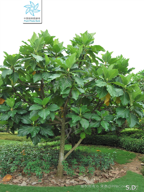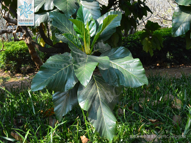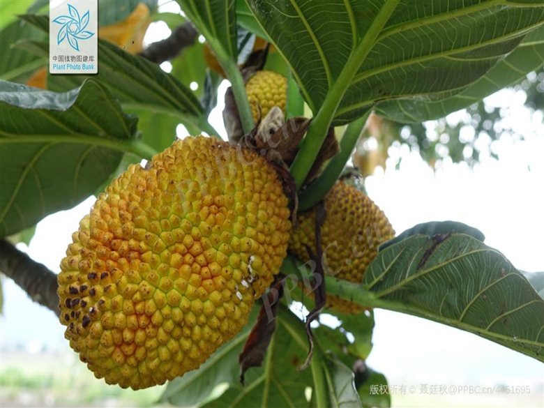 面包树高10-15米,具白色乳汁,树冠球形或扁球型,枝条粗大,树皮灰褐色;叶大,互生,厚革质,卵形至卵状椭圆形,两面无毛,表面深绿色,有光泽,背面浅绿色。一般在春季4—5月份开花,花朵为单性花,花色淡黄,雌雄同株。雌花丛集成球形,雄花集成穗状。面包树一年中的大部分时间都能结果,每个果实是由一个花序形成的聚花果,果实大小不一,大的像西瓜,小的似柑橘。刚从树上摘下来的面包果是不能直接生吃的,当地老百姓会将其放在火上烘烤直金黄色时食用。掰开烤熟的面包果,乳白色的果肉便呈现在面前,香气扑鼻而来。这种烤制的“面包”,松软可口,酸中有甜,与面包风味相似,因此取名为“面包果”。