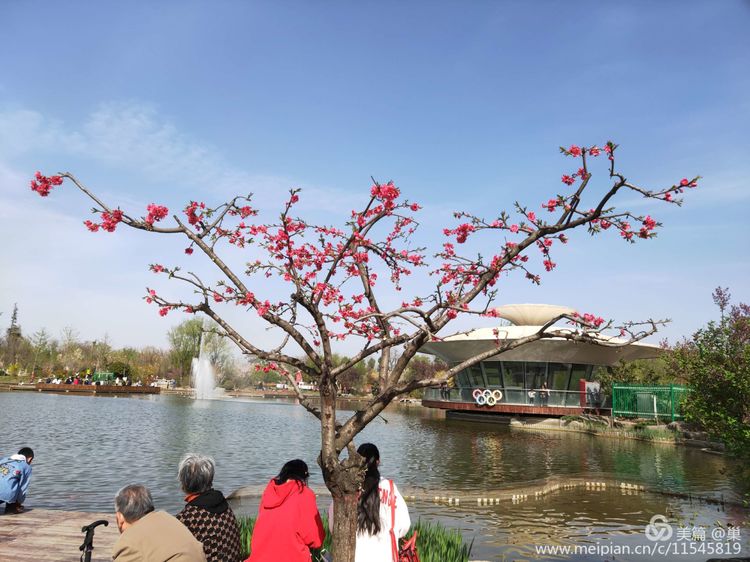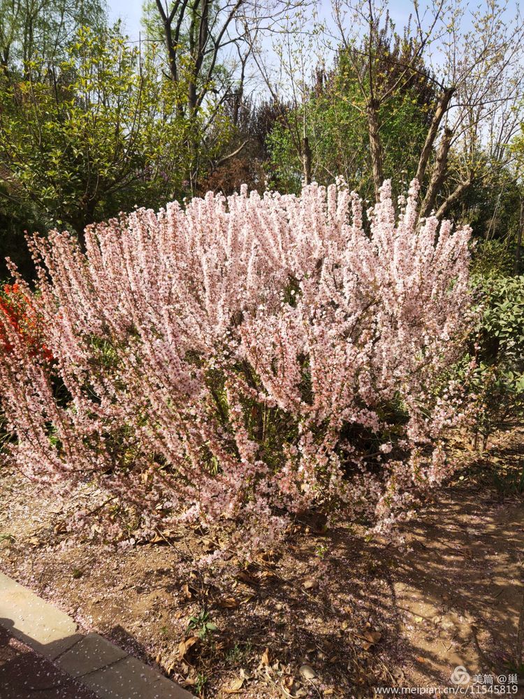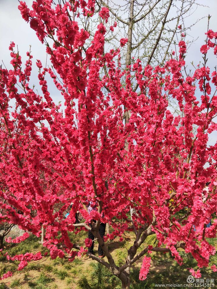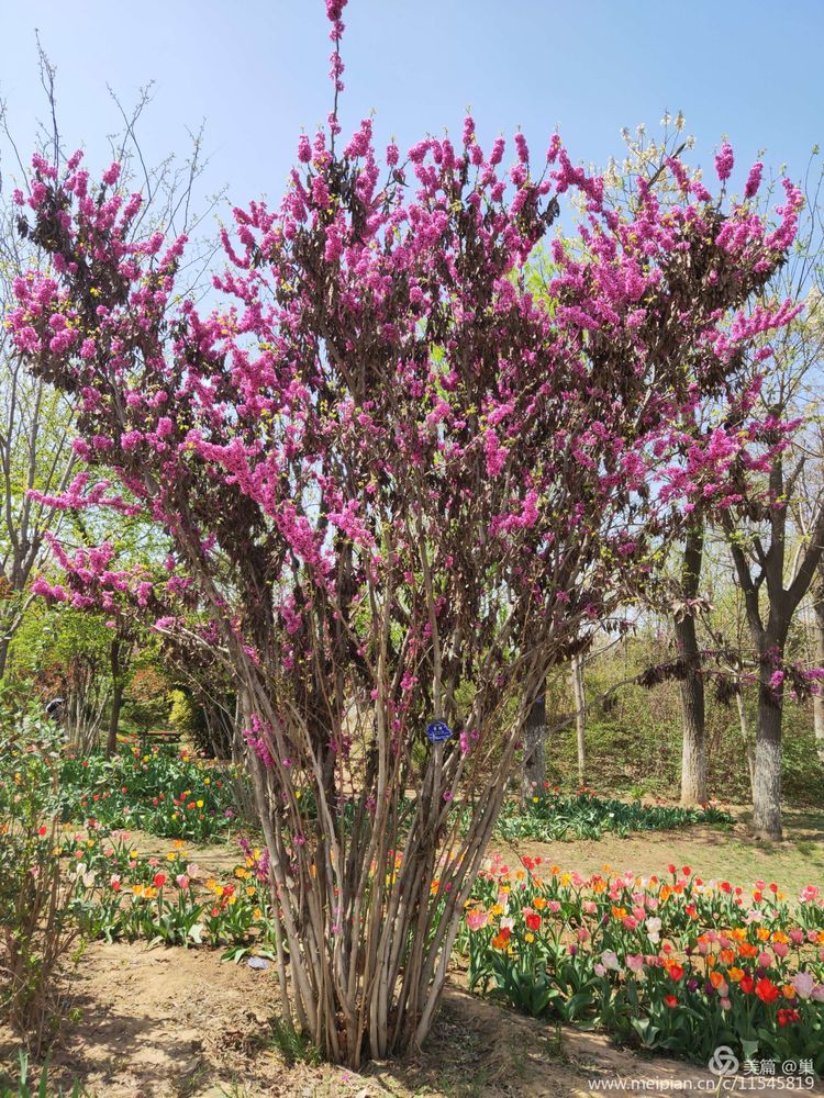 紫玉兰毫不逊色,即使枝头擎那么几朵,也十分醒目别致。白鹃梅被藏在深处,脚下是刚浇过水的泥地,不能近其身,洁白的一簇簇花朵相拥,像嗷嗷待哺的群婴,挤着露出小脑袋来,可它们又优雅很多,绢素得令人不忍碰触,只能远观,生怕是对那种白净的亵渎。原来,这里才是花海!百花齐放,姹紫嫣红。春风十里,花瓣飞舞,沉浸花香,便不知其味,落于草坪之上的各色大小花瓣,无人指挥,便自成绿地花毯,无需润色,一切皆是天然。人与花交织,但人在如此花海之中,声音连同气息几乎全然被淹没,留下的就是花色,花香还有微微春风……想必那浅浅上神最魅之处,依旧是在那片连绵不绝的桃花林中酣睡的样子了……树坑下的清清积水,盛满了桃花的花瓣,不仅没有黛玉葬花的悲伤凄美,反而是落花积水相得益彰的唯美境界!忍不住找一处坐下,就在干的土地上,花枝下,草地中。无论怎样的人,夹在这花海深处,他们都是美的,是那种被净化和浸染了的美。