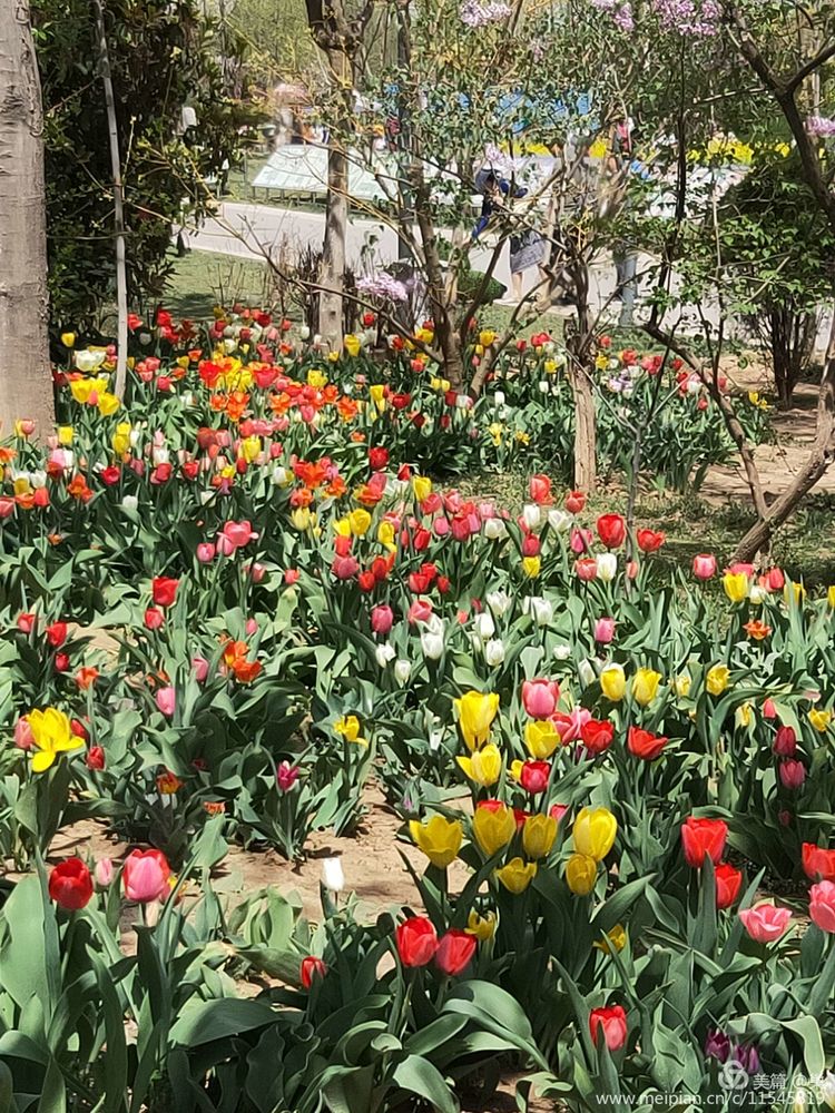 一眼扫去,目不暇接。这也迷人,那也俏丽。那就让贪婪缕缕释放好了。沿路而行,但凡入目的,无不给人惊喜。郁金香这儿一堆,那儿一丛。橘色的一湾,黄色的一畦,红色的一分……无论哪种颜色,任凭你平日喜厌,只要到这里,都让人巴不得枝枝相拥,朵朵相携。白色平素我是不大接近的,可这会看到那溜儿的白色郁金香??,像着了魔,脚被它吸引过去,蹲下来无限柔情地端量起来,丝绸般绵软的花瓣儿,令花蕊显得青黑,花心看起来便成青黑蝴蝶那般了。纵然这么一点,也把人带进了无比洁净的世界去了。风,极有眼力见,那么柔柔一动,将这群仙子的裙摆舞动得不高不低,恰恰张开了那么一个迷人的弧度时它又作罢!