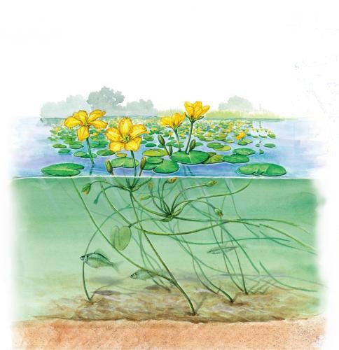 荇菜(Nymphoides peltata):睡菜科荇菜属多年生水生草本植物;荇菜即今天《中国植物志》中的莕菜,古时也写作“莕菜”,李时珍《本草纲目》中说,因其“叶颇似杏”而得名。荇菜的叶片呈卵圆形,上表面亮绿,下表面带紫,基部心形,浮于水面,与睡莲属(Nymphaea)的叶片形状比较相似,因此其属名Nymphoides即表示“像睡莲的”的意思。夏季开花时,鲜黄色的花朵挺出水面,花瓣周边毛茸茸的惹人爱怜。荇菜的叶片漂浮在水面上,根茎深深地扎在水下的泥土之中。从水中望去,一根根纤细的茎条一头连着水面的叶子,一头固定在水底,随着水流不停地摇曳,宛如牵着线的风筝。杜甫的《曲江对雨》中写道:“林花著雨燕脂落,水荇牵风翠带长。” 唐代女诗人薛涛也在《菱荇沼》中描写:“水荇斜牵绿藻浮,柳丝和叶卧清流?!毙熘灸Φ摹对俦鹂登拧分校凶耪庋木渥樱骸叭砟嗌系那嘬?,油油的在水底招摇;在康河的柔波里,我甘心做一条水草。”诗人笔下康桥软泥中的青荇,便是河流中常见的荇菜。