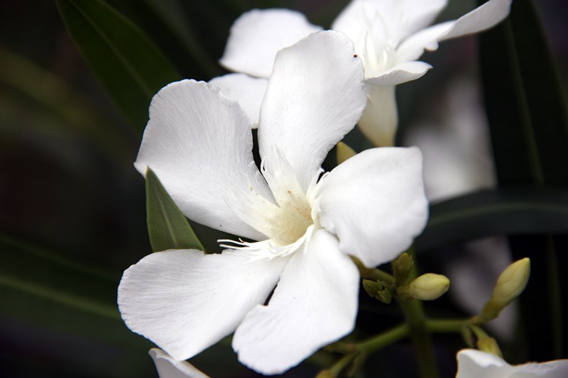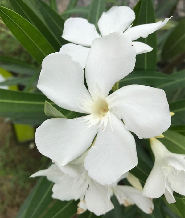 白花夹竹桃(Nerium indicum Mill. 'Paihua')夹竹桃科夹竹桃属,常绿直立灌木。白花夹竹桃属于夹竹桃的变种,它的花聚集在枝条的顶端,一簇簇地开花,白色的花都是单瓣,有香气。白花夹竹桃的花朵有五瓣,若仔细观察的话,你会发现它的花中央还有五瓣流苏状的结构,那是它的副花冠。若是剥开夹竹桃的花,就可以看见它那毛茸茸的雌蕊,就像是昆虫的小触角,雌蕊柱头上具有很多花蜜,黏糊糊的。其他特征如夹竹桃。