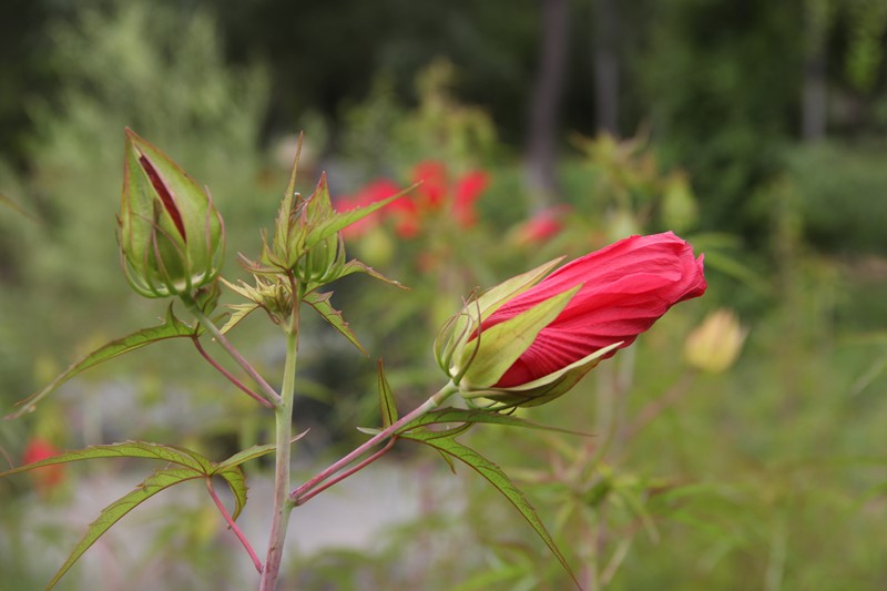 红秋葵(Hibiscus coccineus):又名红葵、槭叶秋葵,锦葵科木槿属,多年生直立草本。原产美国东南部。株高可达1-3米左右;茎带白霜、无毛,半木质化;叶掌状5裂,裂片呈狭披针形,边缘有不规则的锯齿;红秋葵花大而艳丽,花单生于上部枝的叶腋上,深红色的花朵在绿色枝桠的衬托下显得格外娇艳。入冬后地上部分即枯萎,次年春季萌发新枝条。