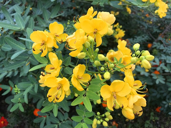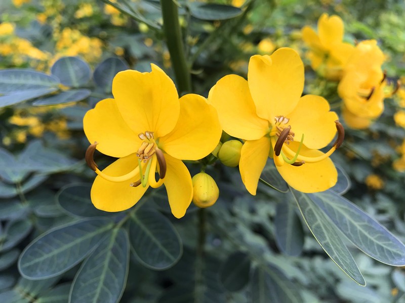 双荚决明(Cassia bicapsularis Linn.)豆科、决明属,直立灌木。原产美洲热带地区。双荚决明的荚果常2个一组,悬挂于枝顶,故名双荚决明。双荚决明的花是成串成串地挂在枝头的,看上去花团锦簇的,其金灿灿的花朵犹如一只只黄蝴蝶在绿叶中展翅嬉戏,分外吸引眼球。走进看,会发现它的倒卵形叶子边缘有金边,衬托得叶子更加显眼。