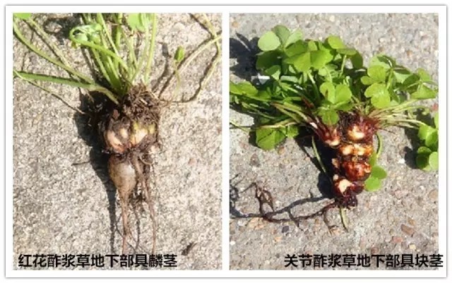 现在总结下:红花酢浆草和关节酢浆草最易识别的特征是花,尤其是花喉部的颜色(红花酢浆草的花瓣喉部为嫩绿色,关节酢浆草的花瓣喉部为紫红色),无花时可看地下的鳞茎,红花酢浆草的鳞茎为球状,关节酢浆草的鳞茎为长圆形,且有关节。另外叶上、花序轴、叶柄等上的被毛,关节酢浆草也远远多于红花酢浆草,红花酢浆草的毛是稀疏。