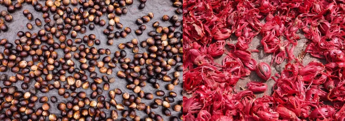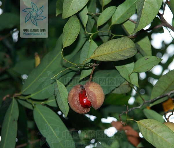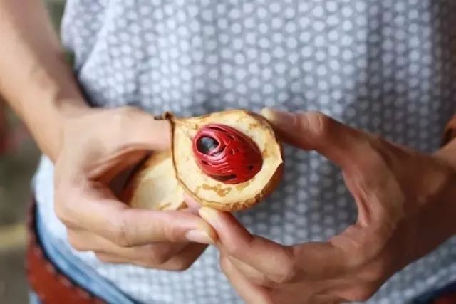 肉豆蔻(Myristica fragrans Houtt)肉豆蔻科肉豆蔻属、小乔木。肉豆蔻树有雌雄之分,只有雌树能够结果,而雄树只有提供花粉的功能。雌性肉豆蔻树会结出水蜜桃般大的果实,熟透后便会裂开,露出褐色的种子,外面包裹着鲜红色的假种皮。【假种皮:顾名思义就是类似种皮但又不是种皮的结构。这层结构通常包裹在真正的种子之外,发挥?;ぶ肿右约按俳肿哟サ淖饔谩!咳舛罐⒖坪芏嗍舳加衅嫣氐募僦制そ峁?,当果实成熟时果皮裂开,露出颜色鲜艳的假种皮,代替果实吸引动物前来采食。动物可以消化假种皮,但是很难消化坚硬的种子,最终随其粪便被排出,在新的地方生根发芽。