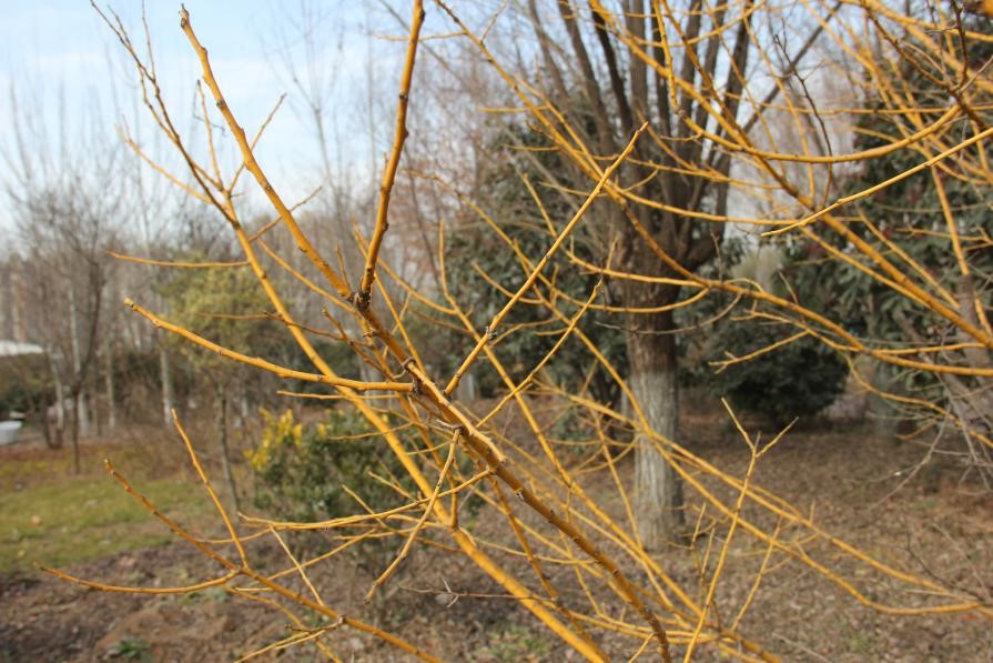 在这充满寒意的季节中,西安植物园中的金枝国槐尤其引人注目,金黄色的树枝在风中摇曳,在蓝天白云的映衬下,美的动人心魄,使得周边的植物都有点儿黯然失色,金枝国槐一枝独秀,成为这片风景当之无愧的“主角”。