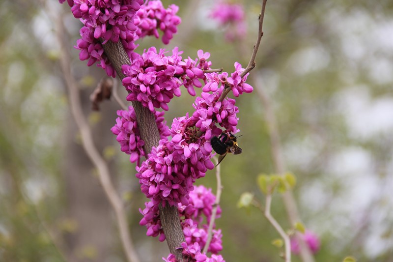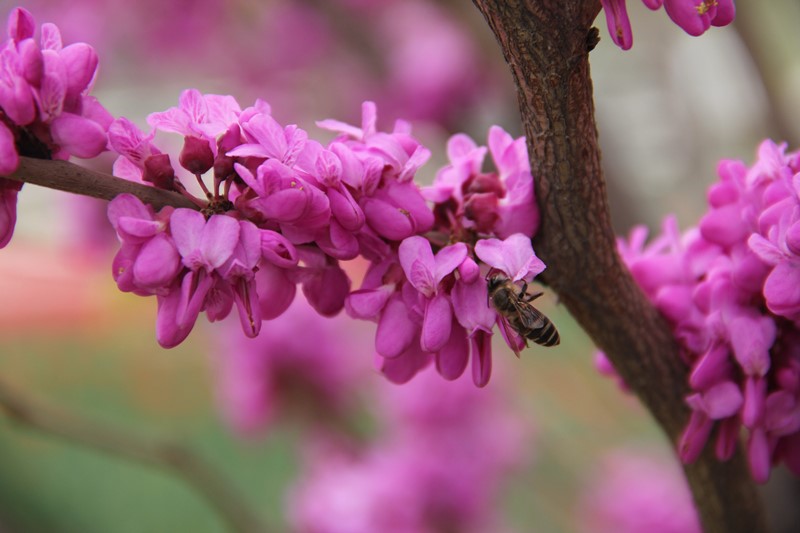 紫荆(Cercis chinensis)从紫荆拉丁名中的加种词chinensis可知它源产中国,豆科紫荆属丛生或单生灌木。早春开花时,花紫红色或粉红色,2-10余朵一束,簇生于老枝和树干上,又称“老茎生花”。有趣的是主干上花束较多,越到上部幼嫩枝条花越少,通?;ㄏ扔谝犊?,但嫩枝或幼株上的花则与叶同时开放。其实,很多植物都有老茎生花的生理现象(如:火烧花、波罗蜜等),这一现象的形成与热带雨林特殊的环境有关。热带雨林物种特别多,处于中、下层的树木不能与上层植物争夺阳光,无法让鲜花高占枝头,它们把花朵开在老枝和树干上,那里比较空旷,花朵更容易被昆虫发现和光顾,这样获得授粉的机会较多,有利于繁衍后代。此外其粗壮的树干也能承受果实的重压。为了生存,必须不失时机的竞争,老茎开花结果是植物在进化中逐渐适应生活环境而形成的生物现象。