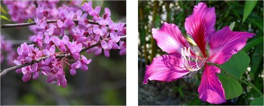 (左图:紫荆的花;右图:红花羊蹄甲的花)