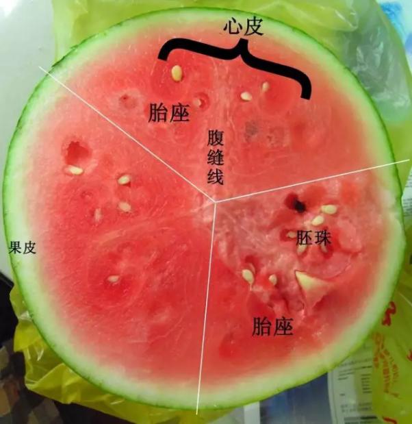 西瓜是葫芦科植物,几乎所有的葫芦科植物果实都有个共同特点,就是具有3个心皮(当然在环境影响下数目可能会发生变化),并且这3个心皮各自并不完全封闭,而是相互联合起来,这样,胚珠就存在在了3个心皮彼此的结合部位,这就是所谓的“侧膜胎座”。然后随着子房的发育,西瓜的一部分果皮和大部分胎座逐渐膨大起来,产生了多汁疏松的细胞组织,这就是我们吃到的“西瓜瓤”了。