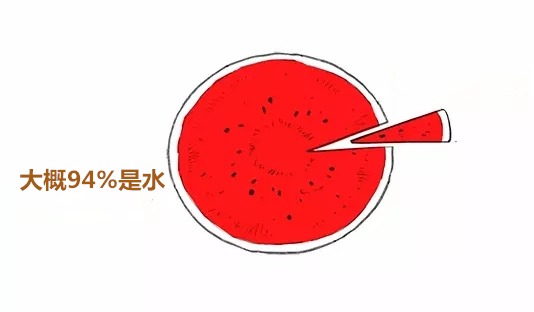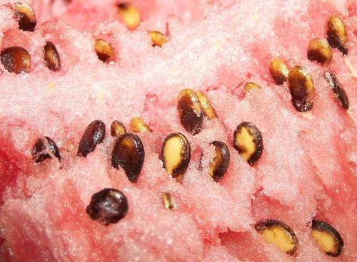 经过几百年的选育,如今的西瓜种子变小了,西瓜瓤带上了红色,胎座也变得异常发达。西瓜的红色,来源于细胞内含有的番茄红素。西瓜内番茄红素的含量可达到2.3~7.2mg/100g,这个含量要比新鲜番茄高出2—4倍。但也不要为了这些番茄红素去狂吃西瓜,毕竟西瓜里的那些糖还赋予了它30 kcal /100g的热量。整个西瓜的含水量高达90%—94%,是名副其实的“水”果。西瓜的水分,储藏在胎座细胞里的液泡内,充满着汁水的液泡将一个个胎座细胞撑成了“小沙?!薄3晕鞴鲜?,我们看到的沙瓤西瓜中一个个晶莹剔透的小颗粒,就是一个个的细胞。