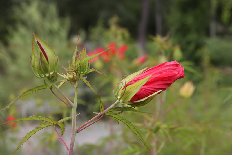 西安植物园内的红秋葵与荷花、睡莲等水生植物一起配植在水景园边,5枚狭长的花瓣,色泽鲜艳,脉络清晰,宛如高挑少女身着的长裙一般。远远望去,枝头上犹如“火球”般热烈的花朵在蓝色天空的映衬下迎着骄阳,开得正欢,那火辣的热情好似感染了整片水景园,似乎也要给炎热的西安再添一把火。正因为这红艳的外表,红秋葵的花语是“热恋”。风起时,“热情”的花浪一浪接着一浪,尽情地展示着自己的美丽。
