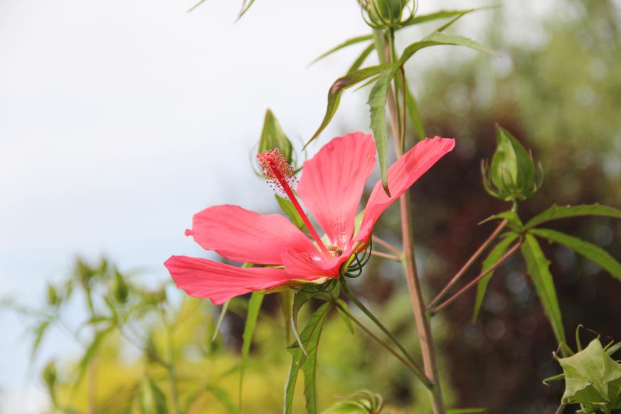 红秋葵(Hibiscus coccineus)又名红葵、槭叶秋葵,锦葵科木槿属,多年生直立草本。原产美国东南部。株高可达1-3米左右;茎带白霜、无毛,半木质化;叶掌状5裂,裂片呈狭披针形,边缘有不规则的锯齿;红秋葵花大而艳丽,花单生于上部枝的叶腋上,深红色的花朵在绿色枝桠的衬托下显得格外娇艳。入冬后地上部分即枯萎,次年春季萌发新枝条。