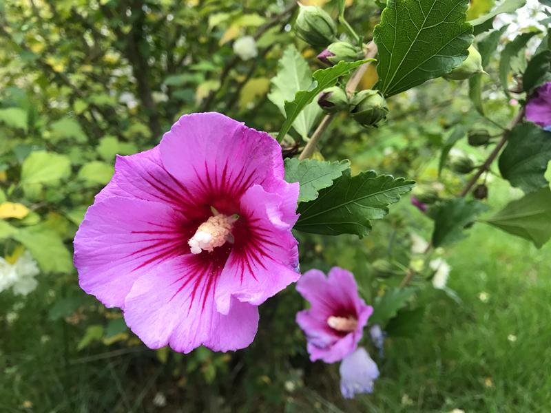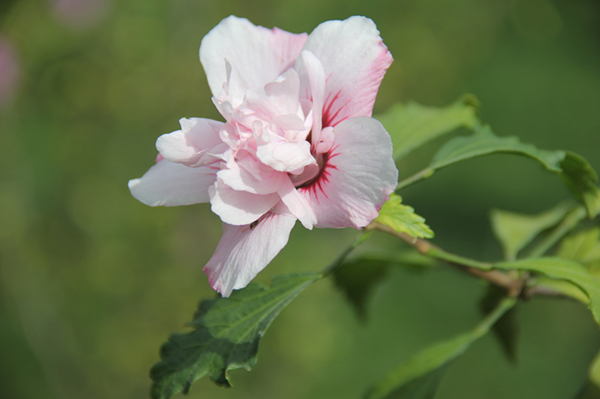 木槿(Hibiscus syriacus)锦葵科木槿属,落叶灌木。叶菱形至三角状卵形,边缘具不整齐齿缺;花单生于枝端叶腋间,花形呈钟状,有单瓣、复瓣、重瓣几种。花朵颜色有纯白、淡粉红、淡紫、紫红等。木槿单朵花花期很短,一朵花只能开放一天,花期结束后它的花朵不是枯萎,而是像茶花一样整朵掉落,因此也称它为“朝开暮落花”。