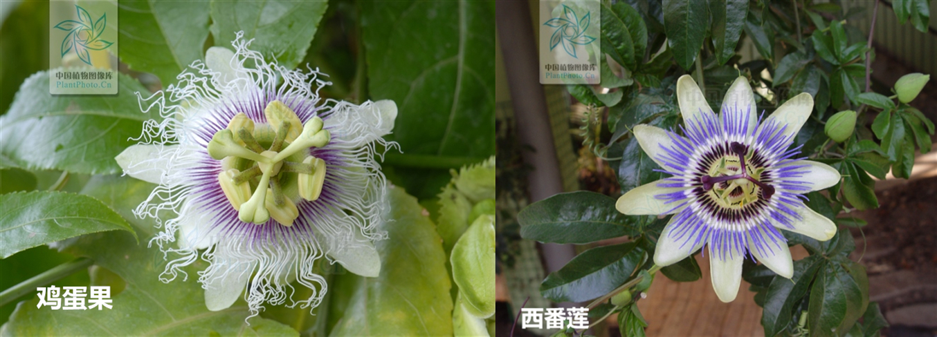根据《中国植物志》记载,西番莲属约有400余种,百分之九十的种类产于热带美洲,其余种类多数产于亚洲热带地区。我国有19种,2变种(包括引种栽培种),分布于南部和西南部。西番莲属的花十分奇艳,最下层10片浅色的“花瓣”可分为两轮,底部一轮是稍显绿色的5片花萼,上面一轮更白的才是5片花瓣。往上就是整朵花最吸引目光的部分——副花冠,这也是大多数西番莲属植物花朵之间区别最明显的部分。一般来说它们的颜色排列各不相同,西番莲(Passiflora caerulea)的须状副花冠呈基部深紫、中部白、顶部淡蓝紫排列,而鸡蛋果(Passiflora edulis)的则是基部淡绿、近基部紫色、尾部白色且呈扭曲状。再往上是花蕊。西番莲属的花有一个雌雄蕊柄,先是分离出5个雄蕊,末端是很大的花药,然后往上是子房,再往上是3个分离的雌蕊花柱。相传在18世纪早期,西班牙的传教士发现了西番莲并认为其特别构造描述了耶稣受难的场景:花的形状像背负的十字架刑具,那些放射状的副花冠像耶稣头上的荆棘冠,10片花冠代表耶稣的10位门徒,花朵最上面的柱头和花药分别代表钉住耶稣的3根钉子和他身上的5道伤痕,花瓣红斑像耶稣头部被荆棘刺出血的形象,杯状的子房象征最后晚餐所用的酒杯。后来还因圆形花盘中的雄蕊雌蕊上下交叠,酷似钟表上转动的时针分针,可供玩赏,被称为时钟花。