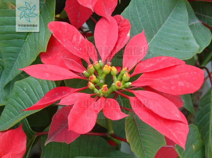 一品红(Euphorbia pulcherrima)又名为圣诞花(台湾称为圣诞红)。大戟科大戟属、灌木,原产中美洲,广泛栽培于热带和亚热带。一品红花色艳丽,由于其开花时正值元旦、春节,盆栽布置室内环境可增加喜庆气氛,极受百姓喜爱。一品红是一种开花时间特别长的观赏植物,不过人们平常认为的“花朵”,其实只是花朵的苞片,它真正的花朵,藏在苞片的中心处,黄绿色,非常小巧。在严寒冬季,一品红那硕大深红的“花朵”,宛如一盆温暖、跳跃的炉火,因此又被赋予了“我心正在燃烧”的花语。