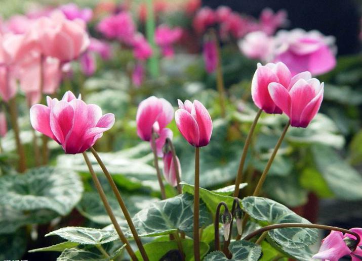 仙客来(Cyclamen persicum)报春花科仙客来属,多年生草本植物。原产希腊、叙利亚、黎巴嫩等地,现已广为栽培。仙客来深绿色的叶面上有白色或灰色的斑纹,其花色艳丽,花形独特,刚伸出来的花苞宛如腼腆害羞的少女,等花朵绽放后5枚花瓣向上反折,就变成了少女心满满的小兔子耳朵,故而又叫兔耳花(兔子花)。一朵朵花像一群活泼可爱的小兔子,在绿丛中蹦跳玩耍,十分有趣。原生的仙客来花瓣是粉红色的,经过多年的驯化,现在已经有了几百个不同颜色、花纹和花型的品种?!跋煽屠础币淮世醋匝鸆yclamen的音译。它又名一品冠,所以也有升官发财的寓意。元旦、春节置于客厅,可使家里增添不少春意和喜气。