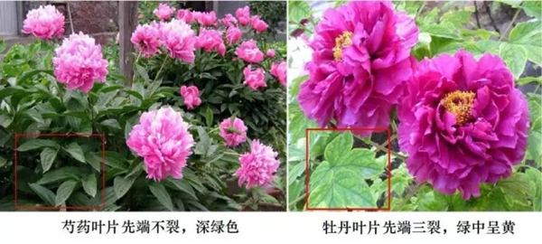 ? 牡丹叶片宽,先端常常再裂成三瓣,正面绿色中略呈黄色;