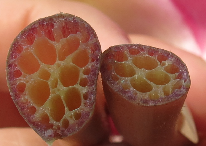 其实这与水生植物自身独特的身体结构有关。如果你仔细观察芦苇、睡莲等的叶柄、茎干和地下茎,会看到横切面上有许多孔,这就是专门用来运输气体的管道切面,称为“通气组织”。这些植物的叶片通常高出水面或漂浮在水面上,通过通气组织,能够使空中的氧气进入叶柄、茎干,再向下扩散到地下茎,这就保证了水生植物的根有充足的氧气进行呼吸。