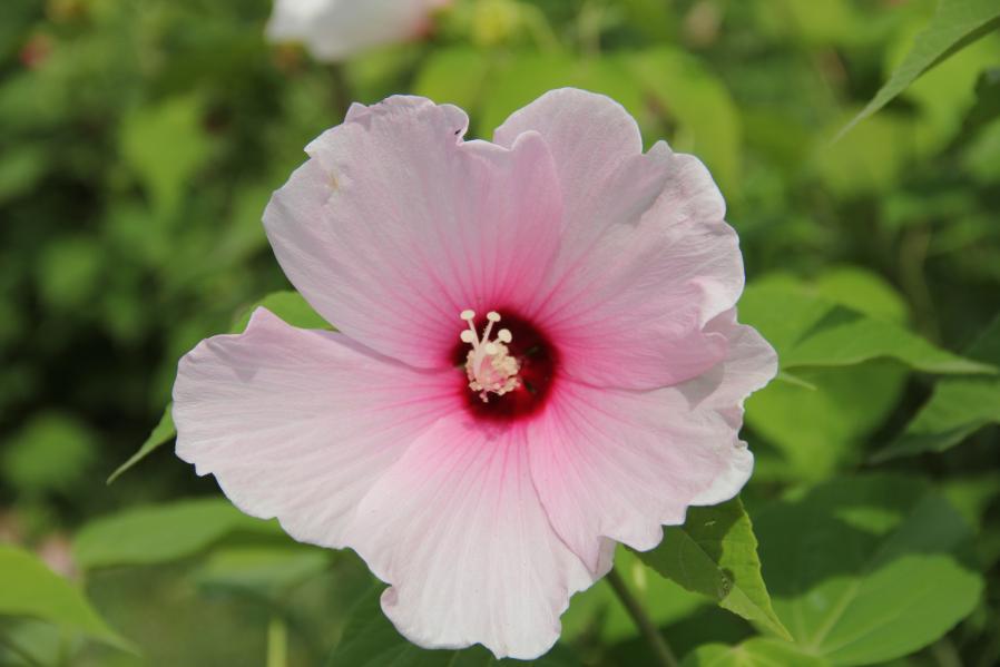 炎炎夏日,西安植物园中的一大片芙蓉葵正值花期,红色、粉色白色的大花在绿叶托衬下,毫不吝啬地展示着自己的与众不同?;ò甏蟮糜行┛湔牛一ㄖ行牡难丈?,远远的就可看到它的存在,像俏皮的孩子鼻尖上点一个大红的圆点?;ㄈ锍こさ?,绒绒的,像一柄小小的如意。初夏至盛夏之际,来园赏花休闲的游客不妨在这片美丽的芙蓉葵花下纳凉欣赏。