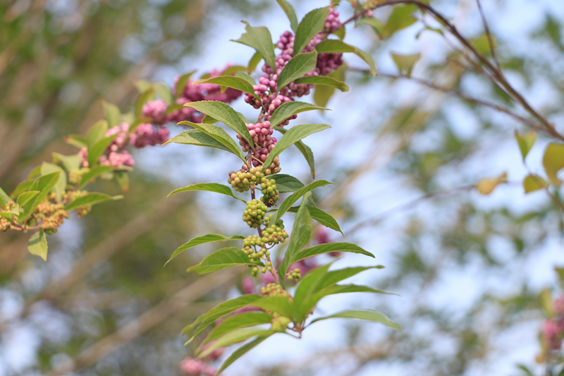紫珠(Callicarpa bodinieri)属于唇形科紫珠属植物,《中国植物志》记载该属全世界约有190余种,主要分布于热带和亚热带亚洲和大洋洲,少数种分布于美洲,极少数种可延伸到亚洲和北美洲的温带地区。我国约有46种,主产长江以南,少数种可延伸到华北至东北和西北的边缘。