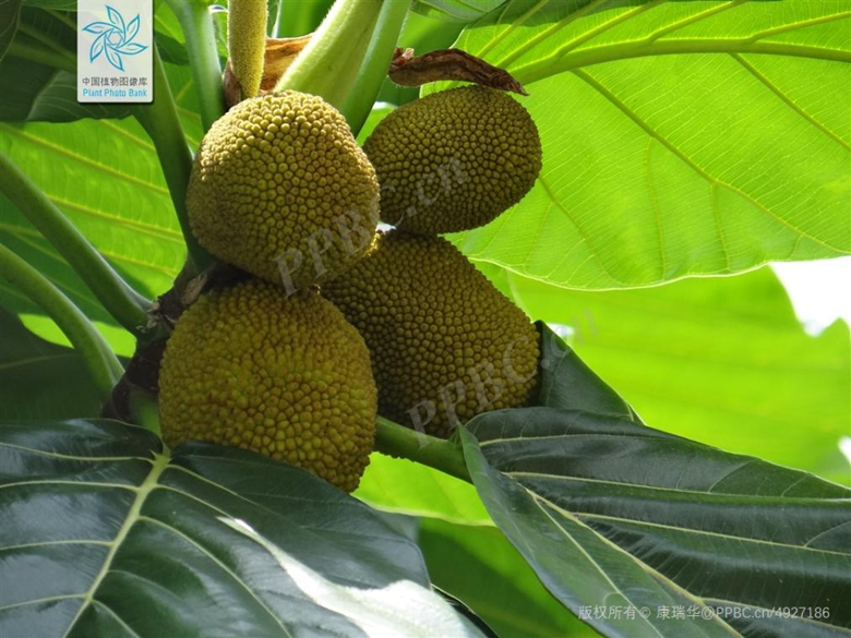 面包树高10-15米,具白色乳汁,树冠球形或扁球型,枝条粗大,树皮灰褐色;叶大,互生,厚革质,卵形至卵状椭圆形,两面无毛,表面深绿色,有光泽,背面浅绿色。一般在春季4—5月份开花,花朵为单性花,花色淡黄,雌雄同株。雌花丛集成球形,雄花集成穗状。面包树一年中的大部分时间都能结果,每个果实是由一个花序形成的聚花果,果实大小不一,大的像西瓜,小的似柑橘。刚从树上摘下来的面包果是不能直接生吃的,当地老百姓会将其放在火上烘烤直金黄色时食用。掰开烤熟的面包果,乳白色的果肉便呈现在面前,香气扑鼻而来。这种烤制的“面包”,松软可口,酸中有甜,与面包风味相似,因此取名为“面包果”。